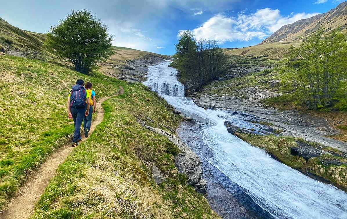 Si camminerà su uno dei sentieri più freschi e bagnati, Cento Cascate, o anche Cento Fonti, che da Cesacastina sale sul versante meridionale, tra boschi di faggio, pascoli d’altitudine, brughiere a mirtillo e cento ruscelli che precipitano a valle lungo il Fosso dell’Acero.