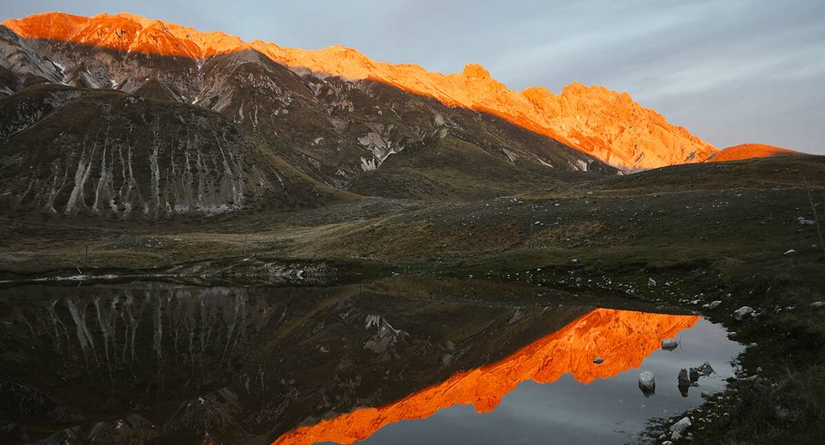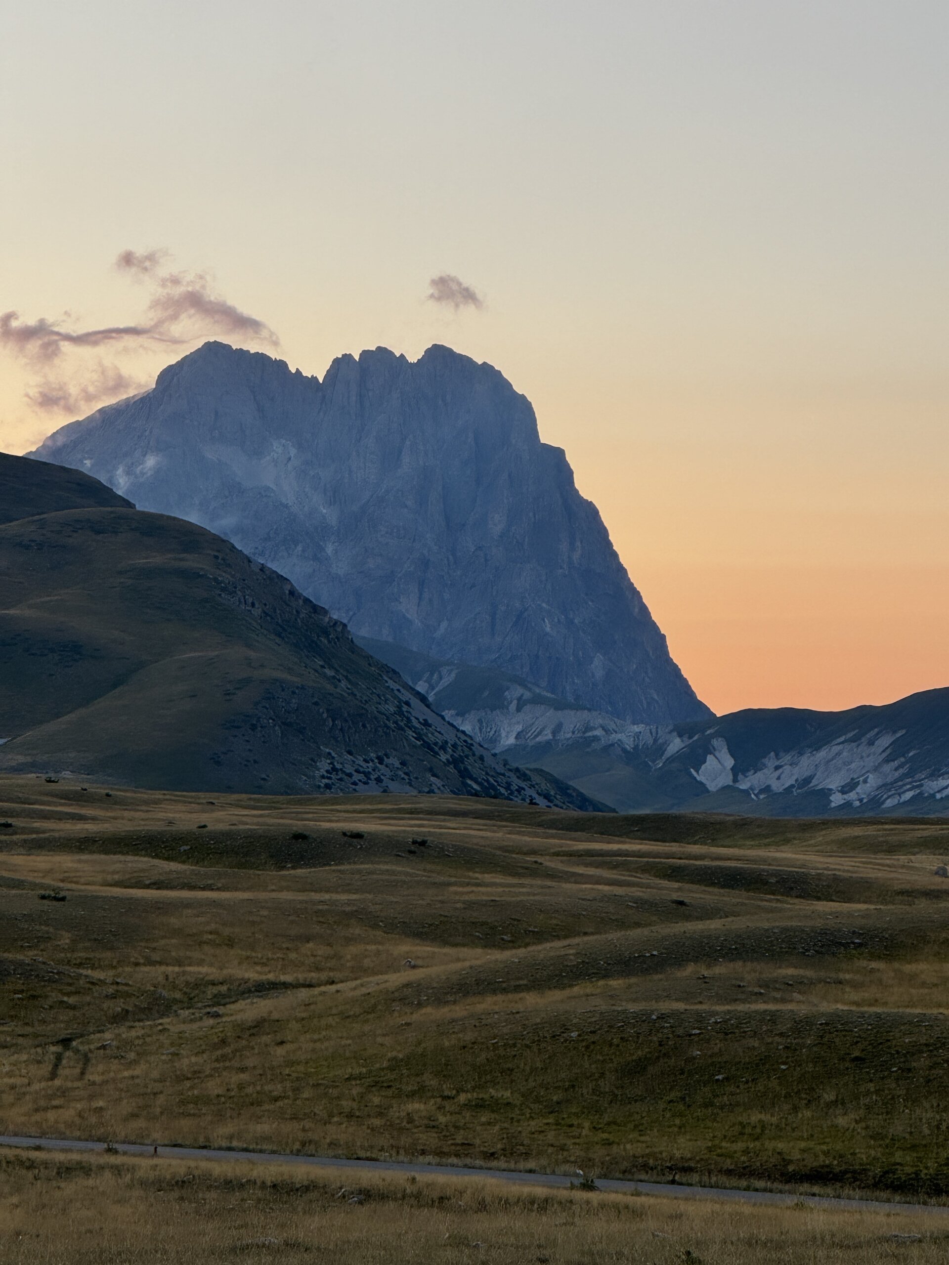 È il tramonto sul Gran Sasso, nel cuore selvaggio e mistico del cosiddetto “Tibet d’Abruzzo”, dove la vastità degli altopiani incontra la quiete dell’anima.